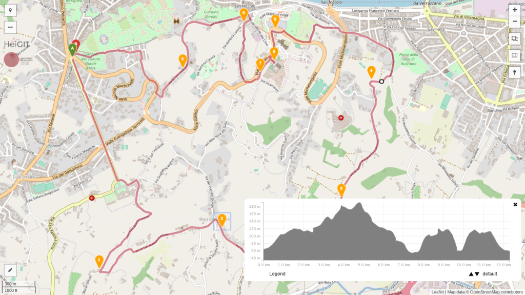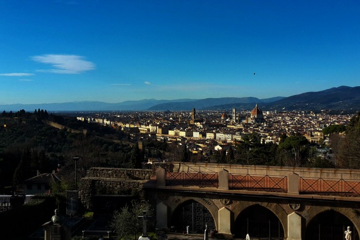 So, let’s cross Viale Michelangiolo into Via dei Bastioni and turn left on Via di San Miniato al Monte, a steep uphill that coasts Florence’s most panoramic campsite. It will help us avoid the traffic of the other streets. At the top, we rejoin Viale Michelangiolo, turning left to soon arrive at the awesome Piazzale designed by Giuseppe Poggi in the late 19th century. This was one of the many projects he developed in his quest to turn Florence into a city suitable to be capital of the newly unified Kingdom of Italy and house the royal family of Savoy. His beautification works are controversial in Florence, but I’ll say he hit a homerun with Piazzale Michelangiolo. The view is amazing – any time of the day, any season of the year – and worth a thousand words. Just enjoy it.