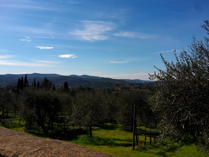 The views of the countryside around Galluzzo soon reveals itself, Renaissance style villas occasionally appearing on each side of the narrow road. Around here, no cars, no people, just chirping sparrows and fluttering turtle doves. We go by Villa Le Piazzole and turn left into Via di San Matteo in Arcetri, flanked by low stone walls and olive trees. On lucky days, it’s possible to enjoy a wonderful panorama and learn some Tuscan geography: Monte Morello, towers above Florence at 3,065 ft (934 m); moving west, the Calvana, also reaches 3,000 ft (915 m) above Prato; across from them, on our side of the Arno river, we can see all the extension of the Montalbano, which peaks at 2,077 ft (633 m) and closes the valley in the distance where it encounters the Appenines by Pistoia and Serravalle Pistoiese. Beyond these geographical features, the high Apennines and the Apuan Alps can be seen on exceptionally clear days.
