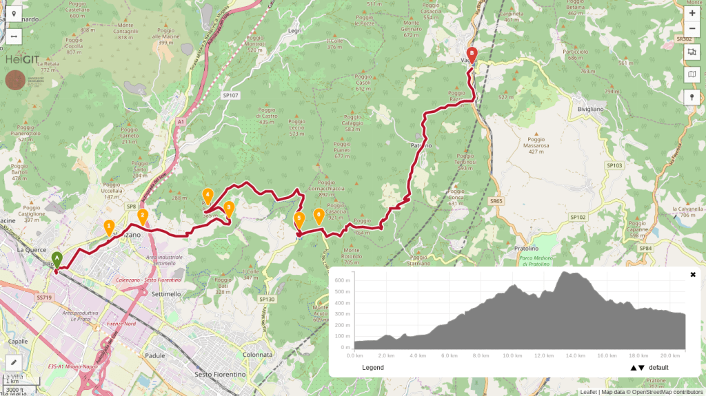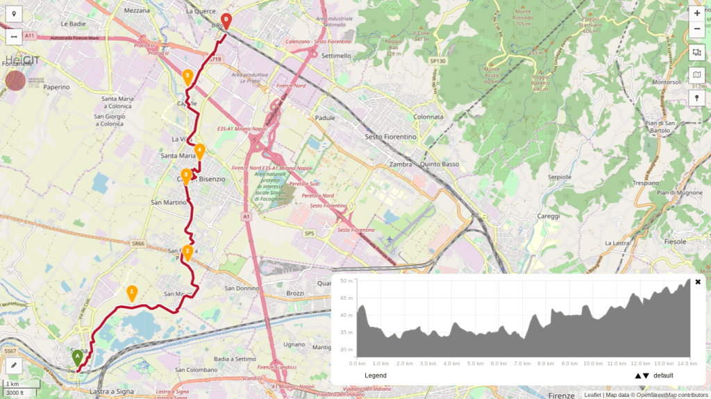 Arriving in Campi Bisenzio, we first notice the imposing Strozzi Fortress, a 14th-century castle that guards the river and is currently under restoration. Practically a suburb of Florence, the town itself doesn’t offer much more, and we can swiftly make our way to Calenzano. After crossing the bridge to the other bank, we continue to follow the river on a very scenic path. By the neighborhood of Capalle, we’ll cross our last bridge of the day and say our goodbye to the faithful Bisenzio who guided us for the past 6.5 mi (10.5 km). We take Via di San Quirico to the tiny and quaint center, then Via di Pantano to meet the Marinella stream. Don’t cross the bridge! Go right towards the highway and the underpass that will bring us to the commercial area of I Gigli – shopping mall, hypermarket, cinemas…the whole shebang. No need to slow down around here, we soon arrive at train station of Calenzano to end this leg of the hike.