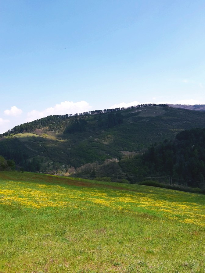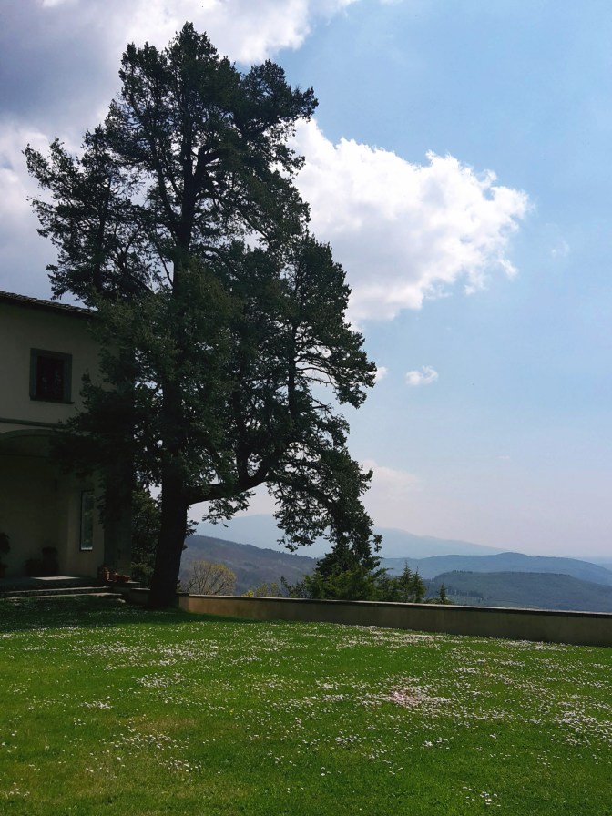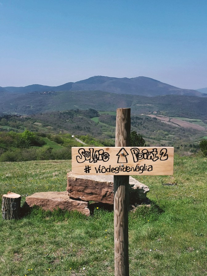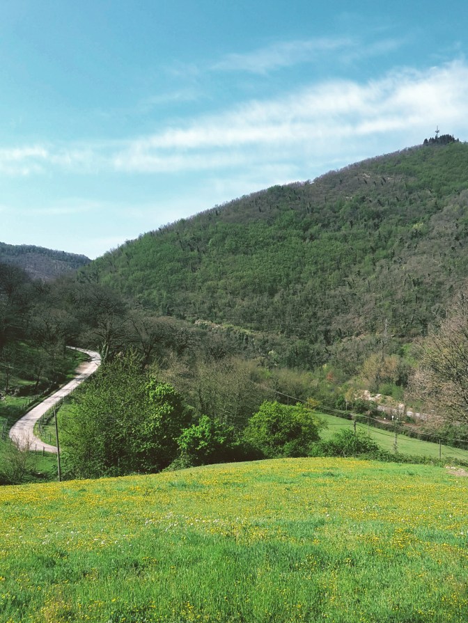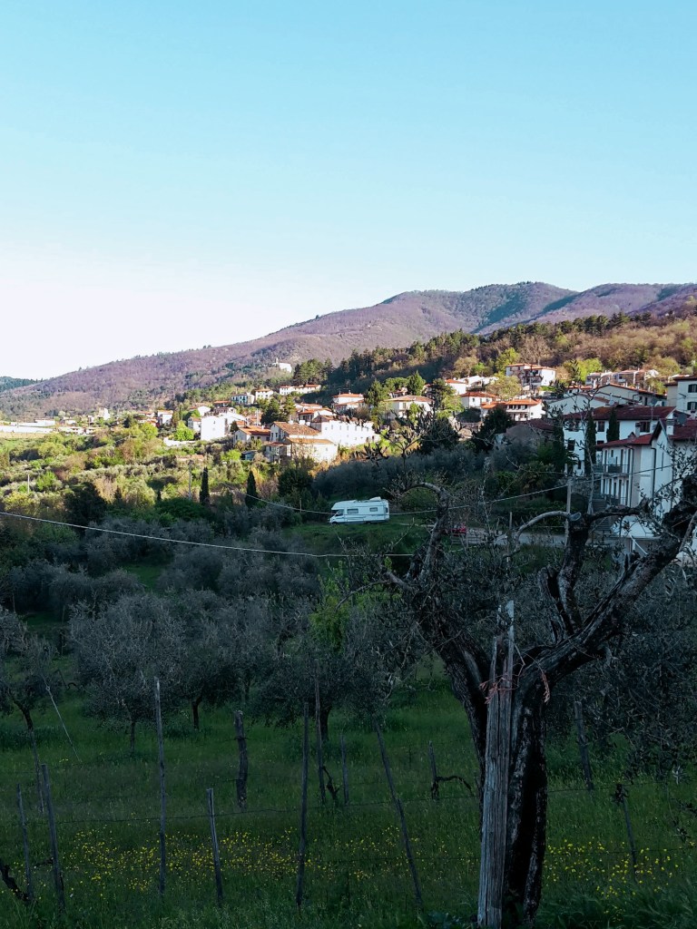 The scenery gets better and better as we get closer to Montefiesole. To the west, the Valdarno – the valley of the Arno river – and its charming greenery of olive groves and vineyards. To the east, the Valdisieve – the valley of the Sieve river – beyond, the imposing Appenine mountain range with some of the highest peaks of the region like Monte Acuto (4,869 ft / 1,484 m) and Monte Falterona (5,427 ft / 1,654 m), where the Arno river is born. Plenty of hiking trails await up there, I have them in my near-future plans.