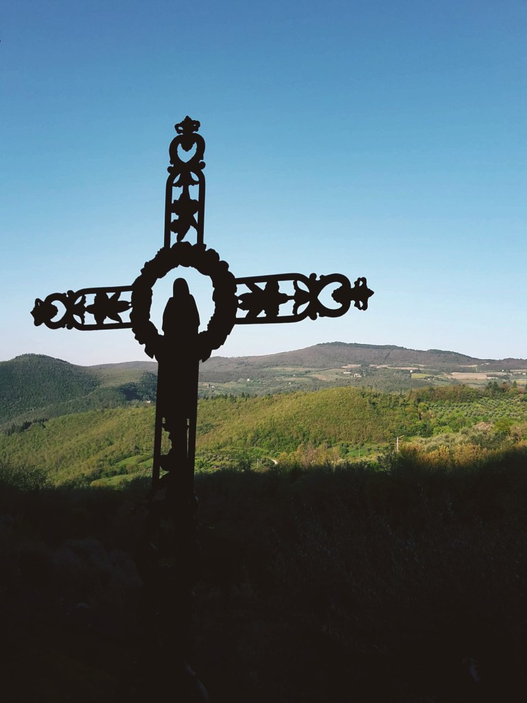 Following Via di Monte Senario, the path becomes familiar – this is also part of Via degli Dei (the Path of the Gods) between Florence and Bologna. Heading downhill on a grassy path to Vetta le Croci, we have a feast for our eyes. Facing south, the vast greenery covers the hills, the valley of the Mugnone river and Fiesole appear on the horizon, and Poggio Pratone dominates the landscape at 2,303 ft (702 m).