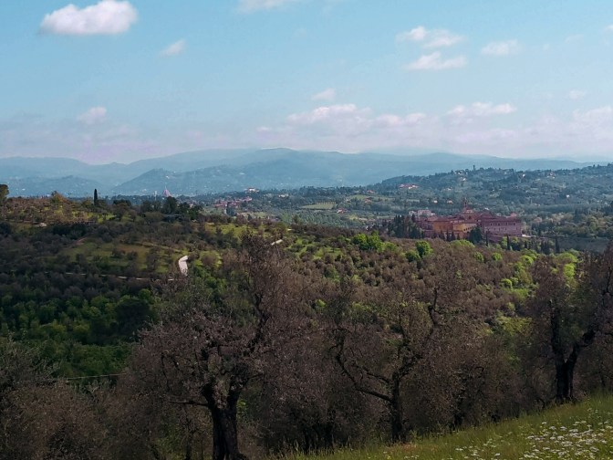 We go up on Via Leopoldo Vanni, but not without noticing a couple of exquisite terracotta vases decorating the main square, prime examples of Impruneta’s great craftsmanship. We walk on Provincial Road n.70, direction Florence, for about a mile. There is a sidewalk for most of the way, and we can enjoy the bucolic scenery with San Casciano in Val di Pesa on the southwest hills. We take Via Quintole per le Rose uphill to Monte di Meccoli, and we’ll continue on this road almost until Galluzzo, passing by the sleepy neighborhoods of Baruffi and Le Rose and two lovely 12th century churches – San Miniato a Quintole and San Lorenzo alle Rose, both in medieval romanesque style. We turn right in Via Brancolano by Villa Antinori delle Rose, which once belonged to the noble winemaking family and now is available for events and lodging. As we approach Galluzzo, we enjoy a fantastic view of the Certosa, and of the convent of San Paolo, on the hill across the highway. Don’t get too distracted. We arrive at a parking area at the bottom of this path without any trail marks on sight. Go straight ahead to Via Senese, cross it, turn right and then left in Via di Colleramole – the Renaissance Ring continues from here.