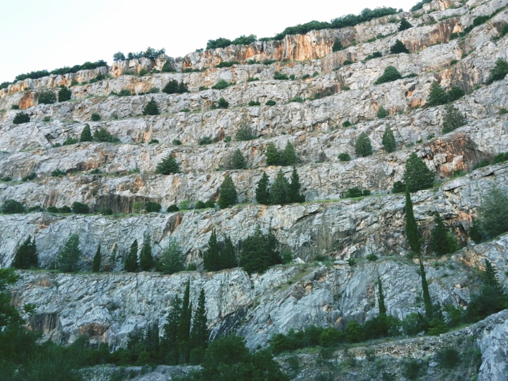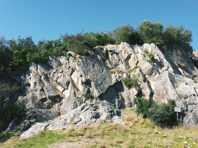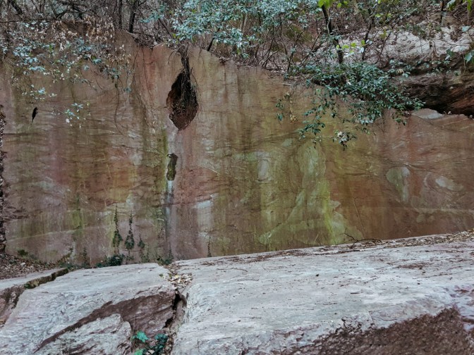 Otherwise, if you’re the hiking type who doesn’t believe in taking it easy like myself (just kidding: I love thermal waters!), we hike uphill again after we pass the resort and its pools to find the path CAI n. 30. This is a very interesting trail that takes us through ancient quarries to the medieval fortification of Monsummano at the top. You’ll need some knowledge of Italian to read the many signboards on the way up. Or, if you are a geology buff, you’ll appreciate this area either way. Several types of limestone and shale form these hills, their colors ranging from a deep greenish grey to a soft red.